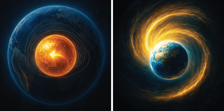 2024년 발표된 〈Nature〉 논문에서는, 내핵이 2010년부터 지표보다 느리게 ‘역회전(backtracking)’을 시작했다는 결과가 나왔습니다. 이 역회전은 지구 전체의 자기장, 지각 응력, 심지어 지진 발생 주기까지 영향을 미치는 ‘행성 심장박동’ 같은 존재입니다. 지금, 그 박동이 바뀌고 있는 거죠.