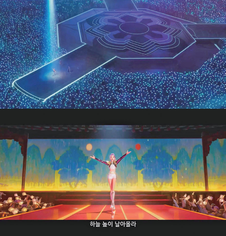 헌트릭스가 공연을 위해 서는 무대의 바닥에는 옛 궁궐에서 볼 수 있는 단청丹靑 문양이, 배경에는 일월오봉도日月五峯圖가 그려져 있다. 단청은 건물의 기둥이나 천장에 오방색五方色(다섯 가지 색)을 칠해 장식한 문양으로, 보기에도 아름다울 뿐만 아니라 악귀를 막는 의미도 담고 있다.