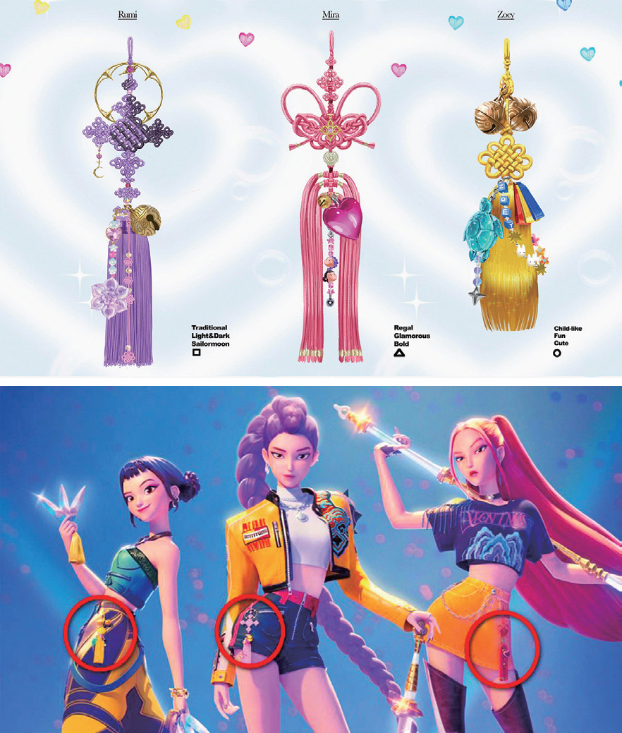 노리개는 한국의 전통적인 장식용 펜던트입니다. 헌트릭스 걸즈는 귀엽고 현대적인 버전을 선보이는 반면, 헌터 출신의 멘토인 셀린은 전통적인 스타일로 고전적인 분위기를 유지합니다. - 영화 디자이너의 X에 올라온 글