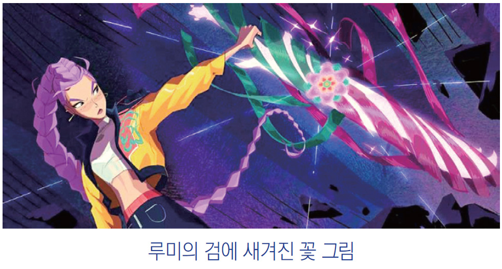 바닥과 천장에 꽃들이 가득하다. 역시 영화에 나오진 않았지만 같은 인스타에 올려져 있는 루미검에는 단청 문양의 꽃이 혼문 실로 만든 검에 피어 있다. 디자이너는 “최종 영화에 나올 법한 모습”이라고 말했다.