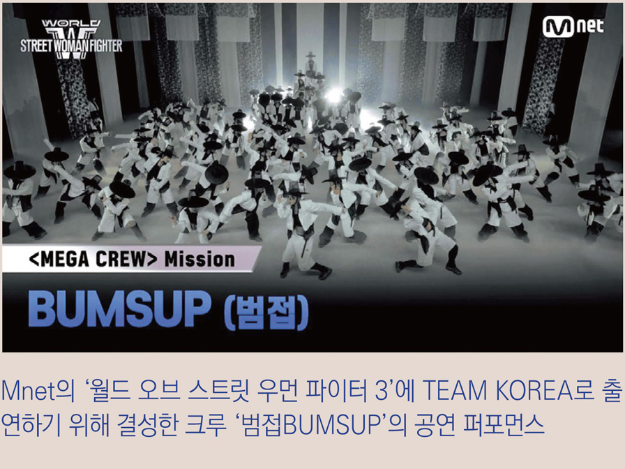 음악 및 버라이어티 전문 채널 Mnet에서는 지난 5월 여성 댄스 크루 서바이벌 프로그램인 ‘월드 오브 스트릿 우먼 파이터 3’(스우파 3)를 방영한 바 있다. 여기에 참가한 한국팀 크루 ‘범접BUMSUP’이 저승사자를 모티프motif(작품의 주제가 되는 구성 단위)로 한 퍼포먼스를 선보여 유튜브 조회수 1550만 회를 돌파하는 등 전통 모티브motive(창작 동기)가 주목받고 있다.